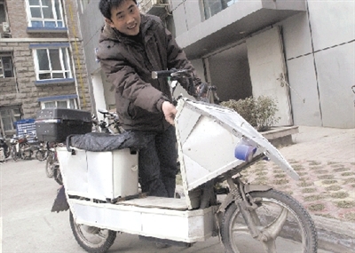 2007年買的電動車沒跑多久,車身上就擦碰得不成樣子。看著車上磕磕碰碰留下的痕跡,小郭就利用自己做裝修的技術,把平時生意上用剩下的邊角料按照車身的大小組裝了一個外殼,然后又用家裝廚衛等使用的鋁扣板用鉚釘固定上去。此外,還加裝了照明燈和喇叭。電動車改裝四五個月來,每每走在街上,都引來眾人好奇的目光。