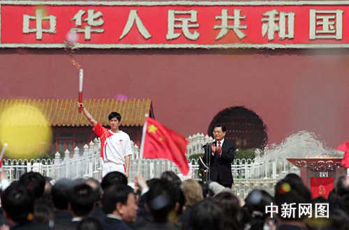 3月31日,北京奧運會圣火歡迎儀式暨傳遞啟動儀式在北京天安門廣場啟動。圖為著名運動員、火炬手代表劉翔從胡錦濤主席手中接過火炬。中新社發 張宇 攝