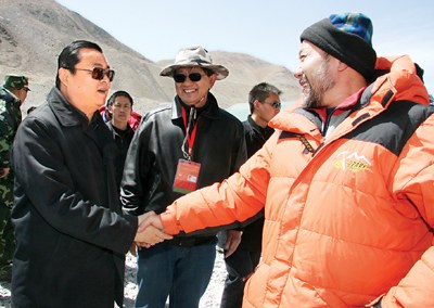 3月30日,在日喀則檢查指導維護穩定和邊境管理工作的自治區黨委副書記、自治區常務副主席郝鵬,公安部副部長張新楓,帶領工作組一行專程前往珠峰大本營,檢查北京奧運會火炬登頂珠峰的安全保障工作情況。