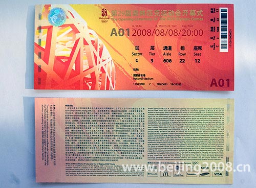 以北京奧運會主場館“鳥巢”和祥云圖案為主要視覺元素的開幕式門票,主題明確、色彩協調、采用了防偽技術。采用紅黃色彩,在祥云的映襯下充滿力量,色彩鮮明奪目,體現了開幕式應有的莊重與相合的慶典氣氛。
