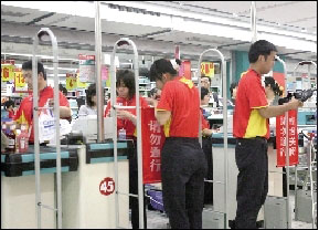 昨天上午9點半左右,在白石橋方圓店,家樂福店員們穿著紅黃兩色的新裝,胸前印著國旗,有的帽子上印著“beijing2008”字樣,有的印著五環(huán)和中國印等標識。記者隨后又來到家樂福中關村店和國展店,兩店的員工也大多身著新裝頭戴新帽。國展店一位女店員說,4月26日,店里給員工發(fā)了新的員工裝,據(jù)說成本是帽子80元、上裝近200元。