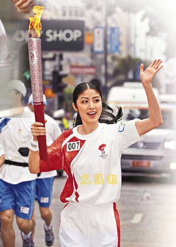 汪明荃昨日盛裝打扮出任火炬手,沿途不斷和市民打招呼。阿姐事后表示,心情興奮。她會將火炬放在辦公室,她亦表示會把火炬帶去供天水圍的小朋友拍照,因為在她跑的行程中,聽到好多小朋友大叫:“加油!中國加油!”( 植毅儀、李慶全、黃國強)