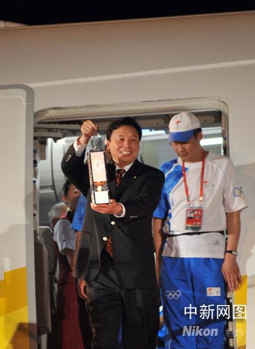 北京奧組委執行副主席楊樹安舉起圣火走下飛機