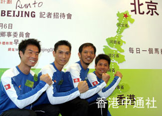 中新網(wǎng)5月6日電 據(jù)香港中通社報(bào)道,為了挑戰(zhàn)自我極限,香港三位長(zhǎng)跑精英和一位區(qū)議員,把握著中國(guó)首次舉辦奧運(yùn)這個(gè)極具意義的機(jī)遇,決心以他們無(wú)比的意志,計(jì)劃花2個(gè)月時(shí)間,從香港跑馬拉松到北京,與祖國(guó)的同胞一同迎接奧運(yùn)。