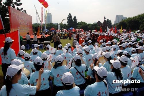 5月15日上午,“迎奧運(yùn)、頌海西”為四川災(zāi)區(qū)賑災(zāi)義演在福州左海公園舉行,一千多名福建省各部門離退休老干部組成合唱團(tuán)參加義演。 中新社發(fā) 鄭祚聲 攝