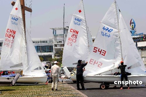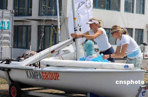為迎戰(zhàn)二00八北京奧運會帆船比賽,美國帆船對已于近日來到奧運會帆船賽舉辦城市青島的奧帆賽訓(xùn)練基地,進行賽前的場地適應(yīng)性訓(xùn)練。圖為美國帆船隊的隊員們準(zhǔn)備下海訓(xùn)練。 中新社發(fā) 曲連遵 攝