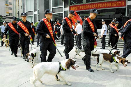 據(jù)悉,此次公安部從全國公安系統(tǒng)選調(diào)204名帶犬民警、204頭搜爆犬參加奧運(yùn)安保工作,廣東抽調(diào)的數(shù)量最多。目前廣東共有16個(gè)地級市公安機(jī)關(guān)建立了警犬機(jī)構(gòu),擁有警用工作犬769頭,占全國警犬?dāng)?shù)量的1/6。