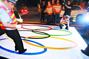 昨晚9點(diǎn),記者在三元橋下出京方向看到,一塊約6米見(jiàn)方的白色色塊被粘在車(chē)道上,施工人員用卡尺畫(huà)出奧運(yùn)五環(huán)標(biāo)志的輪廓,然后再鋪上黑、綠、紅等彩條。