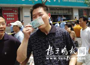 上午10點多,就在兌換紀念鈔快要結束時,排在隊中的一名六旬老翁疼得大叫,腳穿涼鞋的他,被不知是誰的皮鞋踩上了,頓時,擠傷了腳拇趾,鮮血直流,將鞋子都染紅了。老大爺痛苦地蹲在地上,在民警攙扶下,走一步回頭看三眼地退出隊伍。見老大爺如此剛毅,民警與排隊市民協商,征得了同意,他獲得了提前兌換的特別待遇,老大爺如愿換到了紀念鈔。家住中央門死活不愿講姓名的這位老先生告訴記者,他是在兌換營業點紀念鈔還剩20張時幸運換得了1張,雖然到手了,但他卻搖頭直嘆:“為一張鈔票,賠上只見血的腳,真劃不來。”