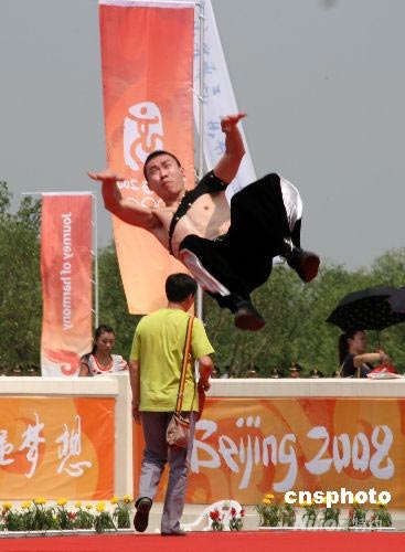 7月11日,北京奧運火炬在哈爾濱傳遞,當地武術運動員在傳遞結束儀式上激情獻藝。 中新社發 周兆軍 攝