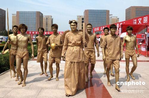 7月14日,奧運火炬在吉林長春傳遞。在傳遞終點長春雕塑公園,青年們裝扮成體育雕塑“傳遞”火炬。 中新社發 廖攀 攝