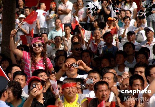 長春市民在路線沿途熱情觀看奧運火炬傳遞。 中新社發 廖攀 攝