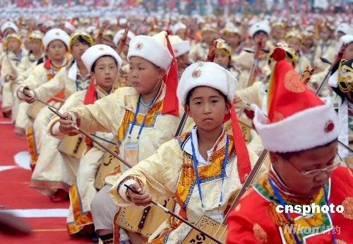 7月15日,奧運火炬在吉林松原傳遞。松原群眾同時奏響2008把馬頭琴迎接奧運圣火。中新社發 廖攀 攝