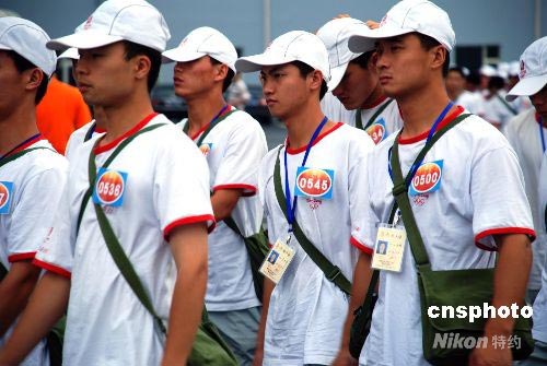 7月15日早上,駐京海軍某部300名官兵身著統一服裝到鳥巢參加奧運開幕式彩排。 中新社發 楊慧峰 攝