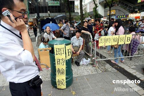 中銀香港發行奧運紀念鈔掀起全城狂熱。連日來數千計市民冒“黃色暴雨”排隊輪候,發售奧運紀念鈔票的各分行滿是擁擠的人龍。七月十五日下午,中銀香港尖沙咀分行向通宵排隊的市民作登記。 中新社發 洪少葵 攝