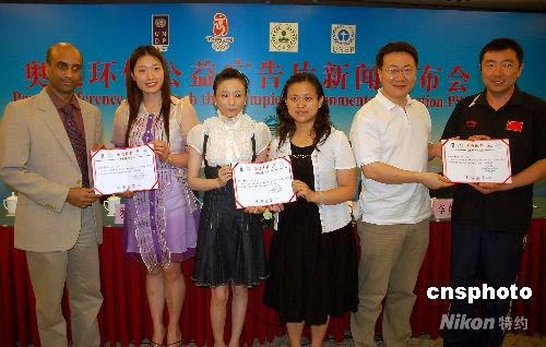 7月15日,在舉世矚目的北京奧運會即將開幕之際,由11位中國奧運冠軍傾情出演的“奧運環保公益廣告片”在北京舉行首映式。由中國環境意識項目出資拍攝的這部公益廣告片,不僅受到了北京奧組委的鼎力支持,而且得到了王軍霞、鄧亞萍、樓云、高敏、樂靖宜、楊揚、楊凌、羅雪娟、桑雪和李永波等奧運冠軍和著名教練的熱烈響應。圖為羅雪娟(左二)、桑雪(左三)和楊凌(右一)代表其他冠軍接受公益廣告拍攝紀念證書。中新社發 潘旭臨 攝