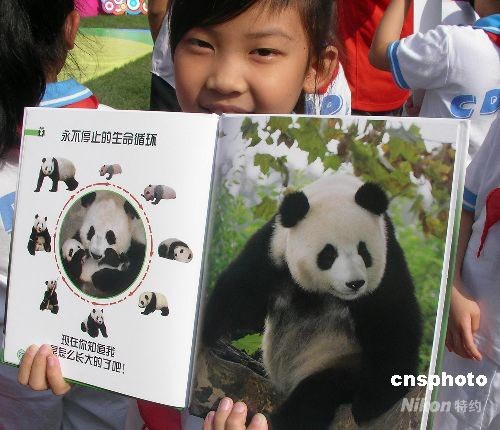 7月16日上午,全球首本由奧運大熊貓“晶晶”擔任主角的科普圖書——《我是晶晶-熊貓成長寫真》中文版在成都大熊貓繁育研究基地舉行了全球首發儀式。該書歷時兩年策劃、設計,由企鵝集團著名的多林金德斯利公司著,童趣出版有限公司編譯,人民郵電出版社出版發行。為表達對震后四川、成都的關愛,該書的全球首發儀式安排在成都舉行。中新社發 楊杰 攝