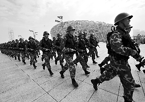 “服從命令、聽從指揮、忠于職守、英勇善戰……”昨日上午9時,鳥巢與水立方之間的廣場上,武警北京總隊某部1500名官兵代表緊攥右拳,向國旗和國際奧委會會旗宣誓。奧運期間,這支武警部隊將負責奧運最核心區域、賽事的警衛及處突反恐工作,是北京賽區任務最重、用兵量最大、投入安保時間最長的部隊。