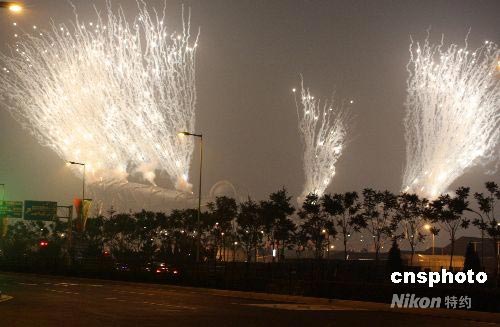 7月16日晚,北京奧運會開幕式彩排首次燃放禮花,鳥巢上空絢爛多彩。中新社發 吳芒子 攝