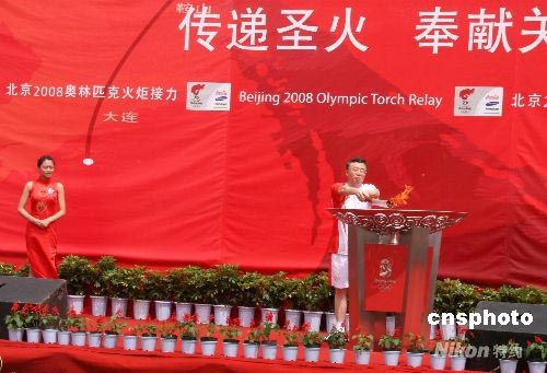 7月17日,最后一棒火炬手、沈陽(yáng)市委副書(shū)記蘇宏章點(diǎn)燃圣火盆,北京奧運(yùn)火炬圓滿(mǎn)結(jié)束了在沈陽(yáng)的傳遞。 中新社發(fā) 周兆軍 攝