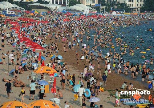 青島第一海水浴場游泳的游人爆滿。經(jīng)過一個多月的全力奮戰(zhàn),困擾2008北京奧運會帆船賽舉辦地青島的近海滸苔已得到了有效的清除和遏制,奧帆賽訓練比賽場地和海水浴場又恢復了往日的熱鬧景象。中新社發(fā) 曲連遵 攝