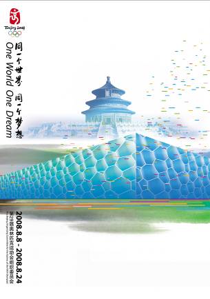 北京奧組委今天(18日)正式對外公布了北京2008年奧運會、殘奧會官方海報和官方圖片。圖為主題海報《文明北京 和諧奧運》。主題海報用象征的手法,由代表北京奧運的體育場館和經典的北京建筑組成,中國水墨意蘊其間,氣韻生動。體育與文化,奧運與中國和諧輝映。該方案三幅合一成為組畫。