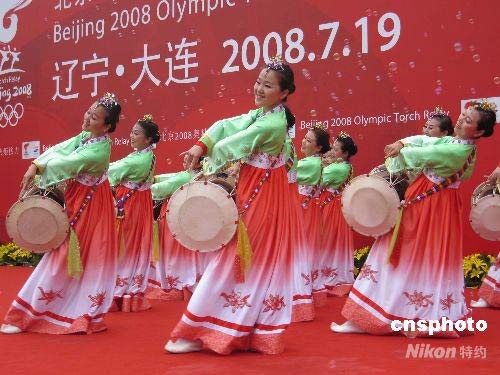 圖為大連民眾跳起民族舞蹈激情迎北京奧運火炬傳遞。 中新社發 沈殿成 攝