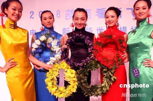7月20日,2008美麗看新飛--新絲路世界模特大賽中國區總決賽在遼寧大連啤酒節上舉行,是次賽事經過在中國5大城市巡演后的最后一站。15名中國賽區職業選手參加了5大城市巡演選拔,最后角逐出了10名最佳模特參加10月在北京舉行的新絲路世界模特大賽國際總決賽。圖為參賽模特選手身穿五色旗袍展示五環奧運風采。 中新社發 錢興強 攝