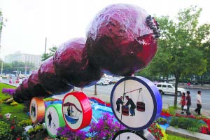 據介紹,目前天安門廣場各個花壇的骨架已經架設完畢,東側花壇中的世界地圖基座、奧運口號基座和“鳥巢”結構均安裝到位,西側花壇中的祥云造型、繞月造型、花樓、心手相連和花彩虹的基座已經就位。