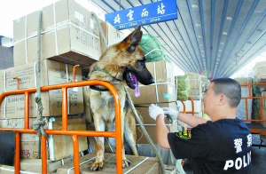 今天上午10時(shí),記者在北京西站行李房看到,5名訓(xùn)導(dǎo)員帶領(lǐng)5條警犬對(duì)所有托運(yùn)的行李進(jìn)行安全檢查。其中3名男民警帶領(lǐng)黑色和淺黃色的拉布拉多犬,而首次出場(chǎng)的女訓(xùn)導(dǎo)員帶領(lǐng)黃色帶棕色斑點(diǎn)的史賓格犬。女警們身穿黑色的警服T恤,黃色的袖標(biāo)上面印有盾牌,貼著“搜爆”標(biāo)志,女警們個(gè)個(gè)顯得英姿颯爽。一名23歲年輕漂亮的女警魯卓鼓勵(lì)了一下自己的愛(ài)犬——1歲多的搜爆犬杰瑞,發(fā)出“搜”的一聲指令,杰瑞立即順著女訓(xùn)導(dǎo)員手指的方向躥向了旁邊的一排大行李箱,努力嗅了起來(lái)。一直工作了三四十分鐘,杰瑞在行李房沒(méi)有發(fā)現(xiàn)可疑物品,又回到了魯卓的身旁。魯卓向警犬表示了友好,好好地鼓勵(lì)了它一下。