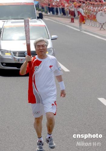 圖為神州飛船(1到5號)總設計師戚發軔在青島傳遞奧運火炬。 中新社發 廖攀 攝