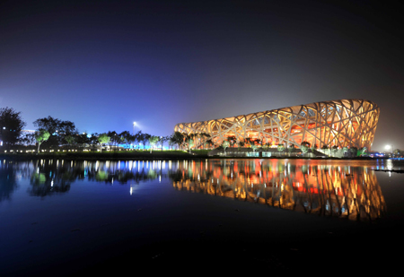 7月18日的臺灣《中國時報》這樣記錄了7月16日晚在“鳥巢”體育館進行的北京奧運會開幕式的第二次帶妝彩排場景。這場彩排首次公開了“鳥巢”夜景照明系統并燃放了禮花。