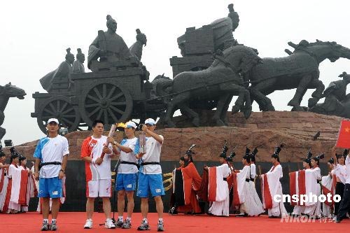 7月22日,奧運火炬結束在山東曲阜傳遞。圖為在孔子列國行雕塑前護衛從曲阜末棒火炬手宮治華手中收回火種。 中新社發 廖攀 攝