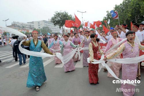 圖:濟南藏族學子載歌載舞歡迎奧運火炬