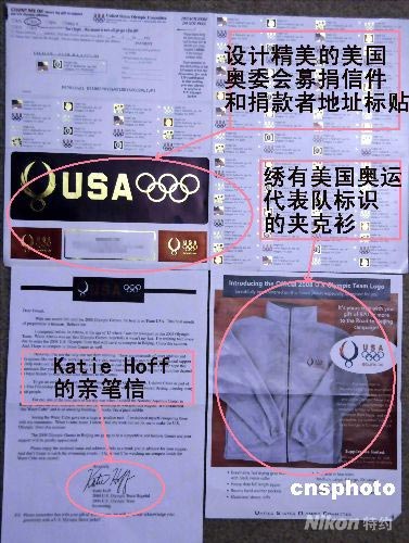 7月22日,記者收到的一封募捐信說:你只需捐20美元,就可以獲得一件如圖所示的繡著美國奧運代表隊標記的運動夾克。更重要的是,這意味著你支持了美國奧運代表隊前往北京參賽的路費。信中還附有美國游泳女一號種子選手霍芙的親筆募捐信。圖為來自美國奧委會的募捐信件內容。 中新社發 邱江波 攝