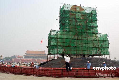 北京天安門廣場中央“中國印·舞動的北京”奧運會會徽花壇與噴泉水池正在建立之中。其中“中國印”為LED光源燈箱,可以旋轉,整個廣場花壇都采用了夜景照明設計,達到白天看花,晚上看燈的效果。中新社發 張雙雙 攝