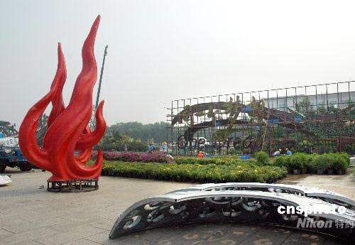7月23日上午,天安門廣場一個火炬造型的裝飾景觀,紅色造型的火炬引人矚目。天安門廣場迎奧運盛會為主題的大型花壇即將完工。中新社發 張雙雙 攝