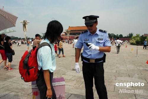 近日,奧運臨近,天安門廣場民警對游客攜帶物品檢查越來越嚴格。圖為巡邏的民警正在盤查游客包裹,以保障奧運會順利進行。中新社發 張雙雙 攝