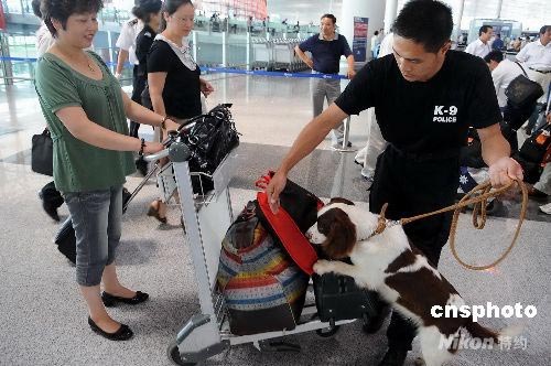 自7月20日始,北京首都機場、上海虹橋、上海浦東、青島、天津、沈陽、秦皇島,以及新疆維吾爾自治區、西藏自治區等19個機場實行特別安檢措施。圖為北京首都國際機場特檢人員攜警犬上崗執勤。中新社發 陳文 攝