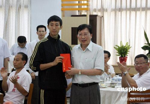 7月23日,臺灣行政部門負責(zé)人劉兆玄在高雄左營體育訓(xùn)練中心看望備戰(zhàn)北京奧運的臺灣體育健兒。他期許運動員們?nèi)σ愿埃〉煤贸煽儭D為劉兆玄在該中心運動員餐廳,向運動員們致贈加菜金,由上屆奧運跆拳道冠軍朱木炎代表接受。 中新社發(fā) 黃少華 攝