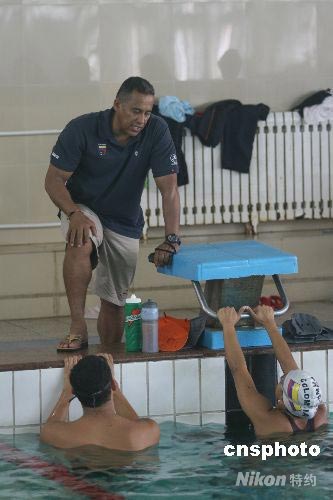 7月24日,參加北京奧運(yùn)會的哥倫比亞游泳運(yùn)動員在教練的指導(dǎo)下進(jìn)行熱身訓(xùn)練。據(jù)悉,哥倫比亞共有5名游泳運(yùn)動員和3名跳水運(yùn)動員取得北京奧運(yùn)會參賽資格。這些運(yùn)動員將陸續(xù)從美國、加拿大趕赴天津,進(jìn)行為期10天的集訓(xùn)。 中新社發(fā) 郭曉帆 攝