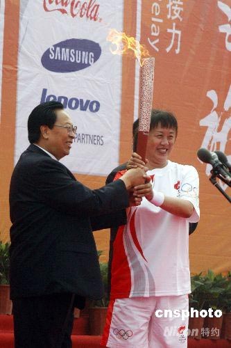 7月25日,原中國女排奧運冠軍、國家體育總局排球運動管理中心書記、副主任張蓉芳作為鄭州奧運火炬傳遞首棒火炬手,從河南省委書記徐光春手中接過奧運火炬。 中新社發 慎重 攝