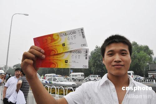 7月25日,第4階段最后82萬張北京奧運會比賽門票向公眾發售,銷售異常火爆。早上7點,銷售現場除了近2萬人在守侯排隊外,在排隊區域外,也有近萬人正在焦急等候進入排隊區。圖為一位來自河南的張先生向記者展示剛買到的兩張奧運門票。張先生說,他特地從河南趕過來,等了24個小時才買到票。中新社發 王宇婷 攝