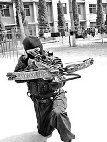 自述:我的外形很傳統,乍一看,有些古代暗器的感覺。但我的威力卻不是其他普通弓箭所能比擬的。有了高科技的幫助,我的射程大大提高。“百步穿楊”是古代高手的絕技。但如今,有了紅外線瞄準器的幫助,任何反恐突擊隊員在使用我時,都可以百發百中。而強力弩弓的穿透力甚至能將15厘米厚的樹木一擊即穿。