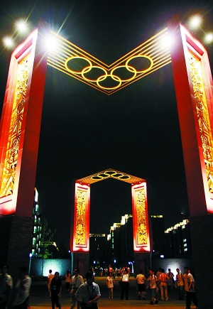 走出宿舍,透透氣,我發現這里還有12個居民服務中心,里面吃喝玩樂都有。當夜幕降臨,我看到那個奧運村生活區朱紅大門上燈火輝煌,五環標志十分醒目。的確,我們是為了奧林匹克精神來到這里。