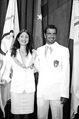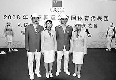 在昨天上午舉行的奧運(yùn)村開村儀式上,由恒源祥設(shè)計(jì)制作的中國奧運(yùn)代表團(tuán)禮服,首次在公眾場(chǎng)合亮相。男運(yùn)動(dòng)員是鮮紅的西裝內(nèi)襯鵝黃襯衫,五環(huán)圖樣烙上領(lǐng)帶;女運(yùn)動(dòng)員則是鵝黃貼身短西裝配白色一步裙,系的是祥云絲巾……看慣了運(yùn)動(dòng)明星們一身休閑裝打扮,突然轉(zhuǎn)換形象,倒也讓人感覺眼前一亮。