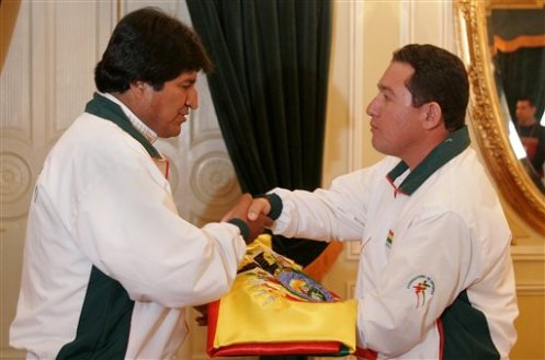 玻利維亞總統(tǒng)莫拉萊斯7月28日在玻總統(tǒng)府為即將出征北京奧運會的玻體育代表團舉行出征儀式并授旗。