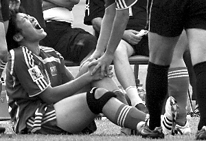 經(jīng)過(guò)專家會(huì)診,基本確定馬曉旭為左膝十字韌帶撕裂,打奧運(yùn)會(huì)已經(jīng)不可能。昨晚18時(shí)50分,馬曉旭被女足隊(duì)醫(yī)背上了出租車,返回了足校。隊(duì)員和教練都到房間里進(jìn)行了安慰,但卻換不回馬曉旭的一絲笑容。今日,她將來(lái)北京做進(jìn)一步檢查。
