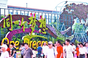 西側花壇的主題為“改革開放共譜和諧篇章”;▔倍螢椴屎玳T與中國結的組合造型,從花山上流下一條五彩的花溪,花溪鑲嵌有象征56個民族的56朵花和為廣大群眾熟悉的心手相連圖案,寓意全國人民萬眾一心、眾志成城、同心同德、團結奮斗建設社會主義和諧社會。同時也寓意心手相連、抗震救災的決心。南段花壇通過杭州灣大橋、嫦娥奔月工程、北京新地標性建筑和農業豐收景象,體現我國改革開放30年來取得的巨大成就。