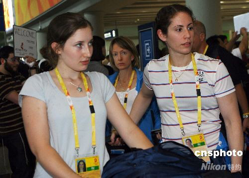 7月31日,美國擊劍隊兩名女運動員隨其它運動員一起抵達北京首都國際機場。 中新社發 劉新 攝